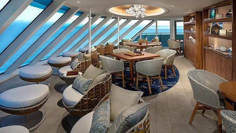 Sky Suite with Infinite Veranda offers all the unique ability to create an open-air room with the touch of a button for a greater connection to the sea and the islands. With a total of 325 indulgent square feet, these rooms offer a modern layout where the bedroom and bathroom are separated by a glass divider featuring a coral-like design. Stateroom: 325 sq. ft. and Veranda: 88 sq. ft.
