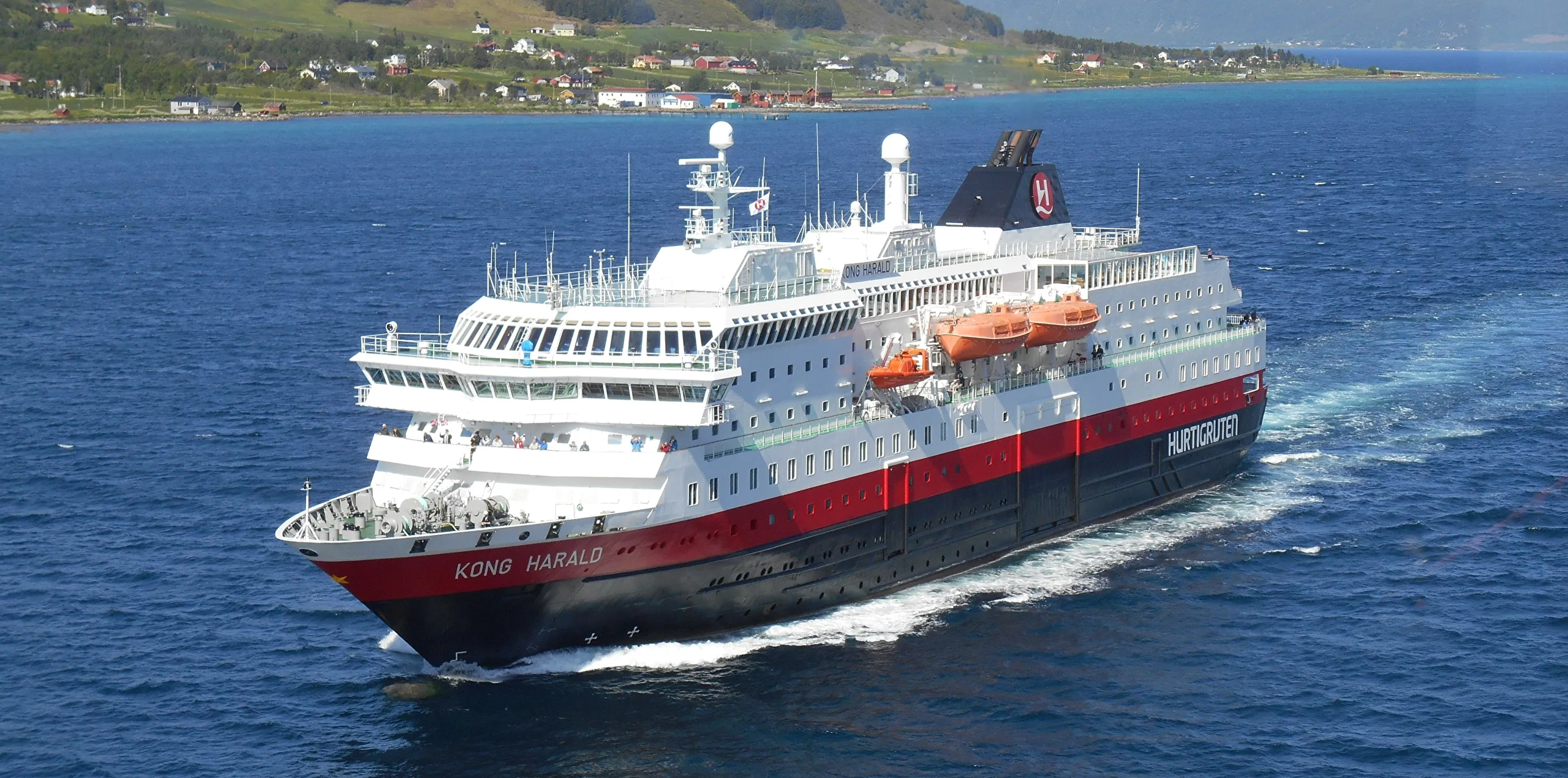 MS Kong Harald was refurbished in 2016 and now features a modern, Arctic-inspired interior. On board are three different restaurants, the Multe bakery and ice cream bar, a sauna and fitness room. Out on deck you can enjoy the view from one of our two hot tubs. There is a comfortable bar at the front of the ship where you can enjoy a nice traditional drink.