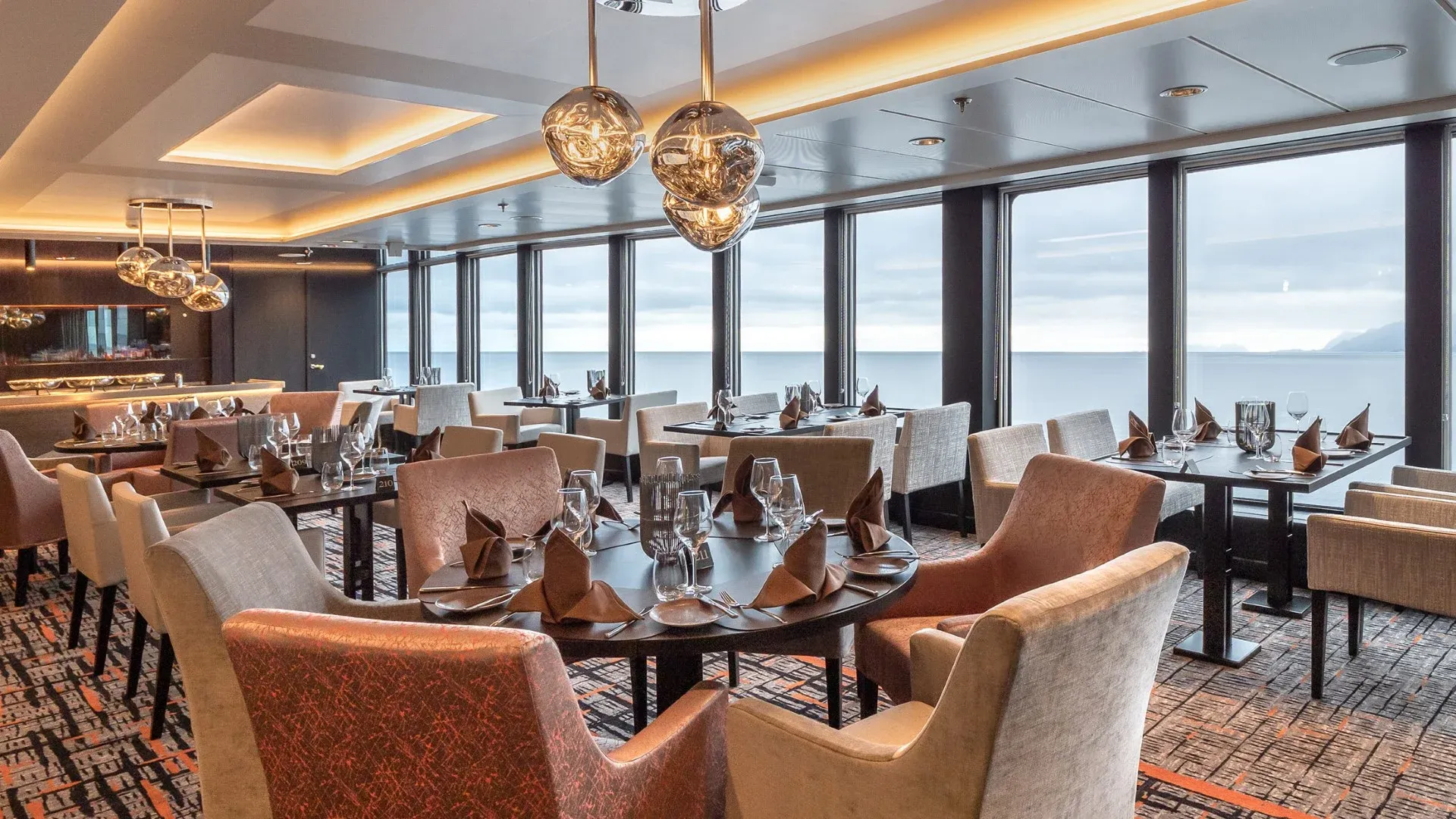 The stunning scenery is reflected in a rich and comfortable interior design. Scandinavian materials from nature, such as granite, oak, birch and wool are used to create relaxed and stylish cabins and public areas. All cabins are outside cabins, of which 50% have private balconies, and aft suites feature private outdoor hot tubs with spectacular views.